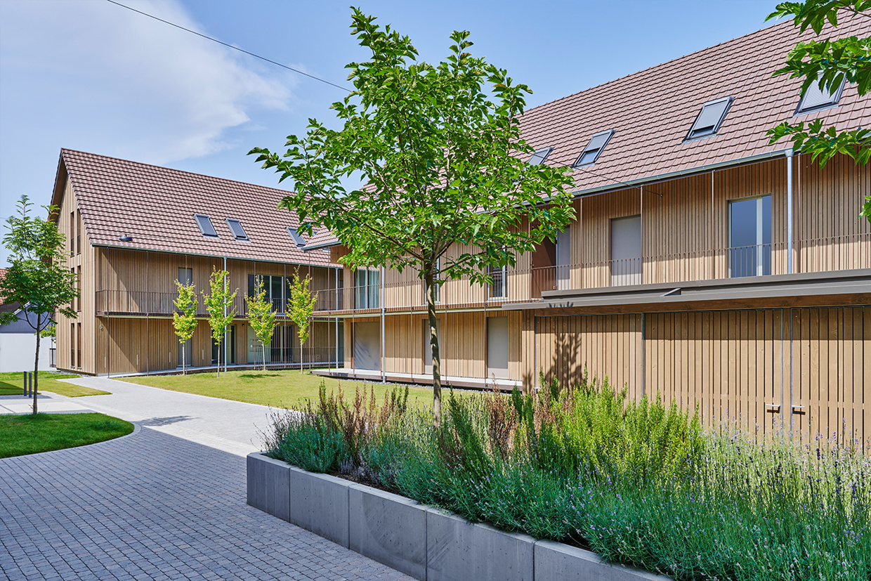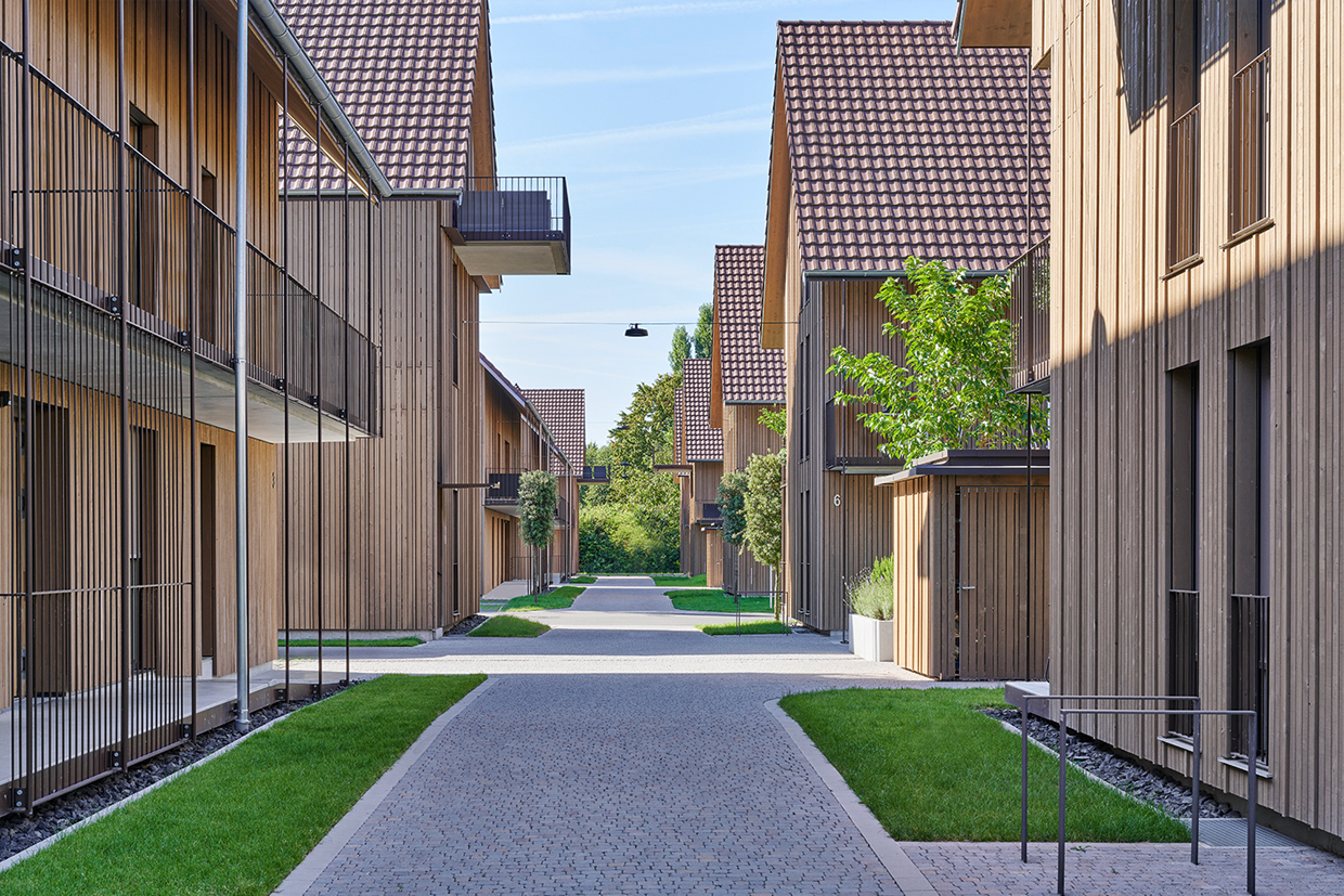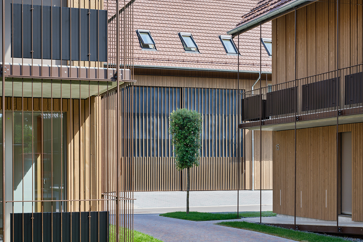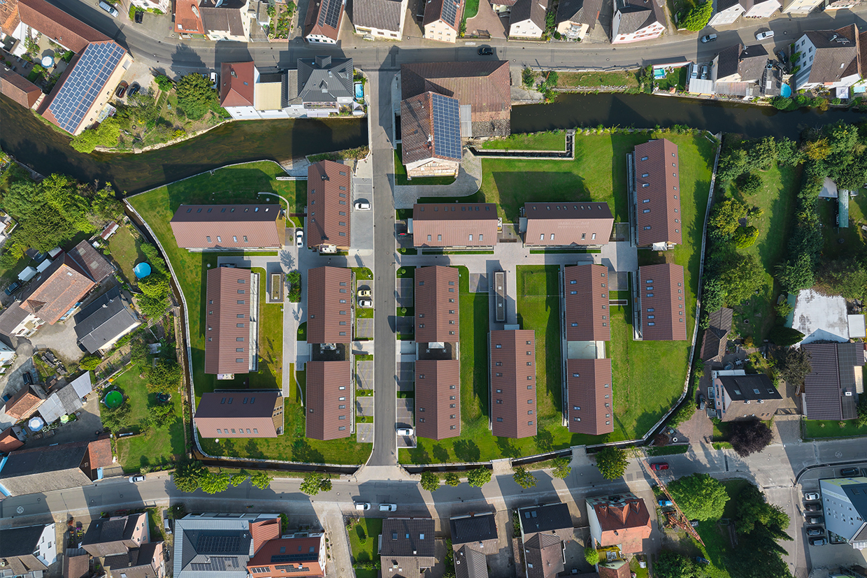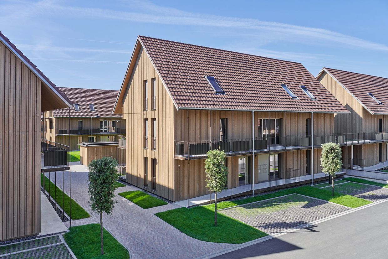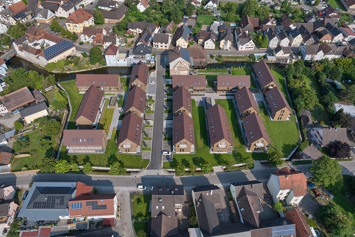 Die zweigeschossigen Gebäude mit Satteldächern orientieren sich an der giebelständigen Bauweise des Ortes und fügen sich harmonisch in die Umgebung ein. Die Nord Süd Ausrichtung der Baukörper schafft attraktive Sichtachsen und eine klare Quartiersstruktur.