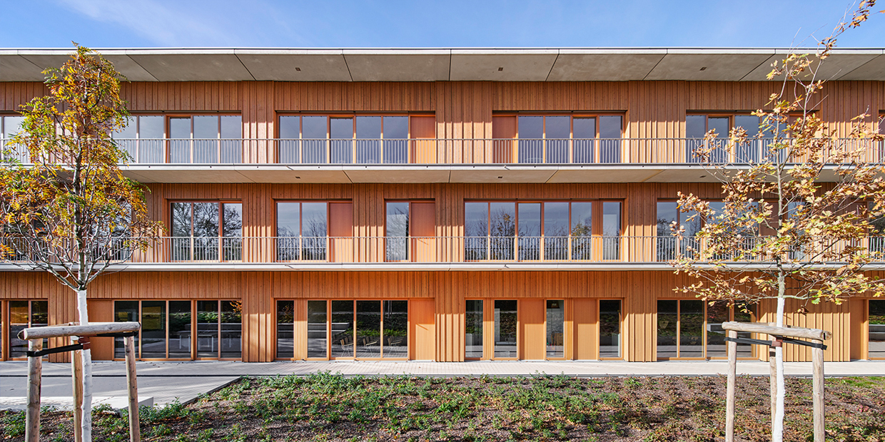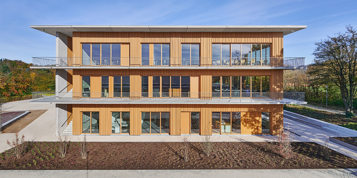 Der Entwurf berücksichtigt nicht nur ökologische Ziele: …. mit integrierter Solarnutzung auf leicht geneigten Dächern, mit geringer Außenhülle und witterungsgeschützten Holzfassadenmodule, mit austarierter Tageslichtführung…… sondern verfolgt auch eine effiziente und rationelle Fertigung, besonders im Fassadenbereich, und dadurch kürzere Bauzeit.