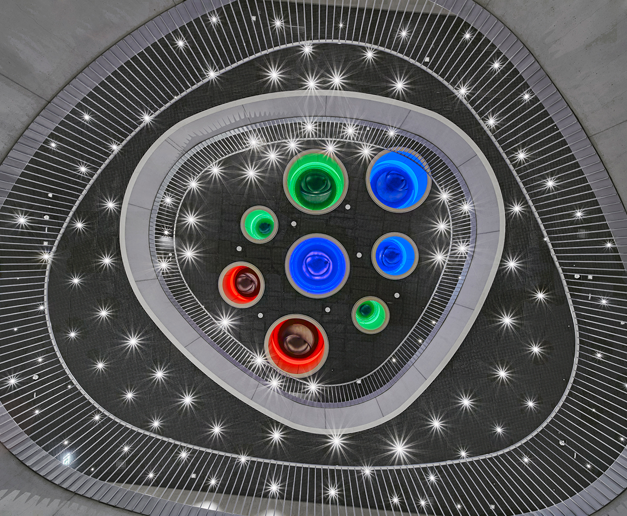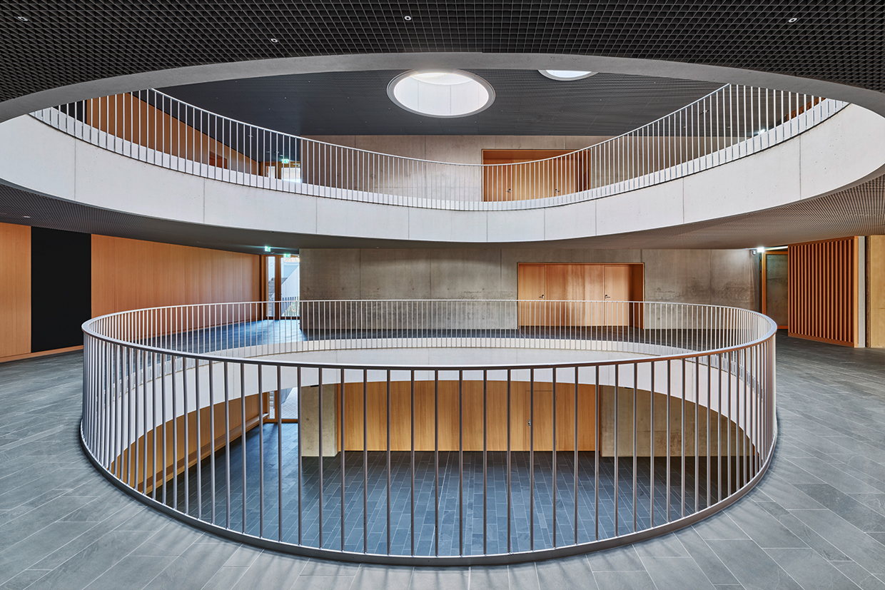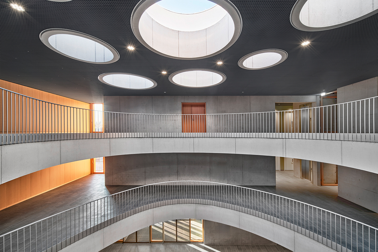 Die durchgehende „Magistrale“ als Rückgrat verbindet das gesamte Raumkontinuum pro Stockwerk klar und übersichtlich. Es sind die kurzen Wege innerhalb der gewünschten klassenübergreifenden Raumkonzeption, vorbei an begrünten Lichthöfen (Patios), es sind Nischen am Flurende für Rückzugsmöglichkeiten, welche den besonderen Reiz und die innenräumliche Atmosphäre abwechslungsreich mitgestalten.Alle Räume der Schule haben über raumhohe Fenster und die umlaufenden „Laubengänge“ einen direkten Ausgang ins Freie. Außenliegende Fluchttreppen ermöglichen es auf innenliegende Entfluchtung zu verzichten. Dadurch lässt sich das gesamte „Lernhaus“ frei bespielen. Teilweise geschosshoch verglaste Wände zu dem breiten Korridor sowie Trennwände sorgen für Transparenz (soweit gewollt), für eine natürliche Belichtung der Flurzonen und eine hohe Nutzungsflexibilität. Trotzdem sind die Räume sowohl im getrennten als auch im gekoppelten Zustand klar strukturiert.