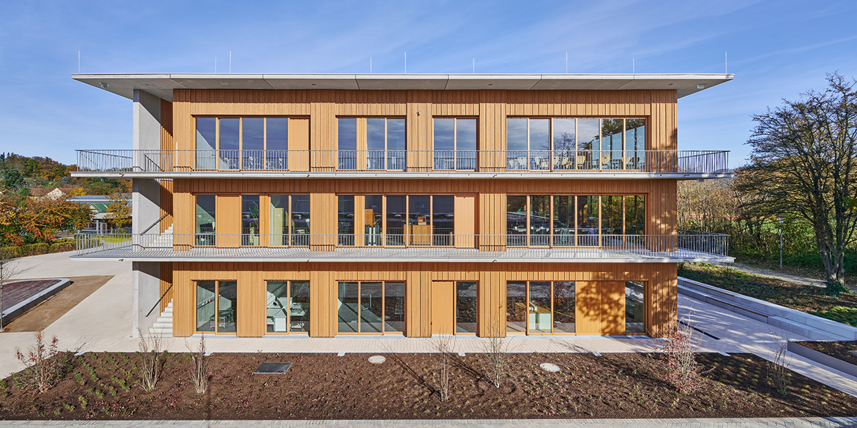 Der Entwurf berücksichtigt nicht nur ökologische Ziele: …. mit integrierter Solarnutzung auf leicht geneigten Dächern, mit geringer Außenhülle und witterungsgeschützten Holzfassadenmodule, mit austarierter Tageslichtführung…… sondern verfolgt auch eine effiziente und rationelle Fertigung, besonders im Fassadenbereich, und dadurch kürzere Bauzeit.