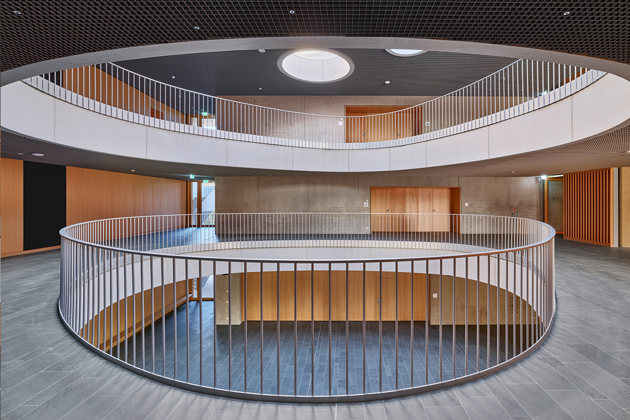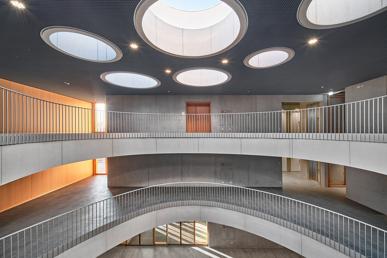 Die durchgehende „Magistrale“ als Rückgrat verbindet das gesamte Raumkontinuum pro Stockwerk klar und übersichtlich. Es sind die kurzen Wege innerhalb der gewünschten klassenübergreifenden Raumkonzeption, vorbei an begrünten Lichthöfen (Patios), es sind Nischen am Flurende für Rückzugsmöglichkeiten, welche den besonderen Reiz und die innenräumliche Atmosphäre abwechslungsreich mitgestalten.Alle Räume der Schule haben über raumhohe Fenster und die umlaufenden „Laubengänge“ einen direkten Ausgang ins Freie. Außenliegende Fluchttreppen ermöglichen es auf innenliegende Entfluchtung zu verzichten. Dadurch lässt sich das gesamte „Lernhaus“ frei bespielen. Teilweise geschosshoch verglaste Wände zu dem breiten Korridor sowie Trennwände sorgen für Transparenz (soweit gewollt), für eine natürliche Belichtung der Flurzonen und eine hohe Nutzungsflexibilität. Trotzdem sind die Räume sowohl im getrennten als auch im gekoppelten Zustand klar strukturiert.