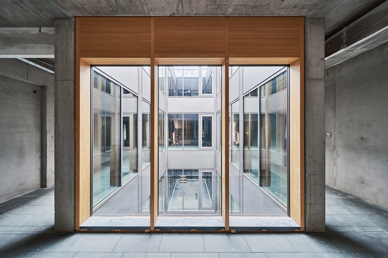 Die durchgehende „Magistrale“ als Rückgrat verbindet das gesamte Raumkontinuum pro Stockwerk klar und übersichtlich. Es sind die kurzen Wege innerhalb der gewünschten klassenübergreifenden Raumkonzeption, vorbei an begrünten Lichthöfen (Patios), es sind Nischen am Flurende für Rückzugsmöglichkeiten, welche den besonderen Reiz und die innenräumliche Atmosphäre abwechslungsreich mitgestalten.Alle Räume der Schule haben über raumhohe Fenster und die umlaufenden „Laubengänge“ einen direkten Ausgang ins Freie. Außenliegende Fluchttreppen ermöglichen es auf innenliegende Entfluchtung zu verzichten. Dadurch lässt sich das gesamte „Lernhaus“ frei bespielen. Teilweise geschosshoch verglaste Wände zu dem breiten Korridor sowie Trennwände sorgen für Transparenz (soweit gewollt), für eine natürliche Belichtung der Flurzonen und eine hohe Nutzungsflexibilität. Trotzdem sind die Räume sowohl im getrennten als auch im gekoppelten Zustand klar strukturiert.