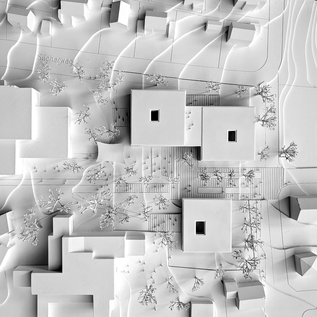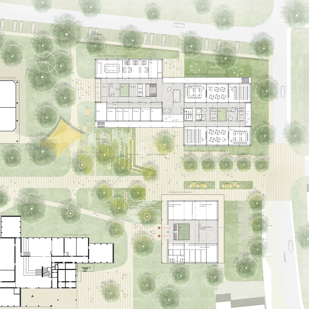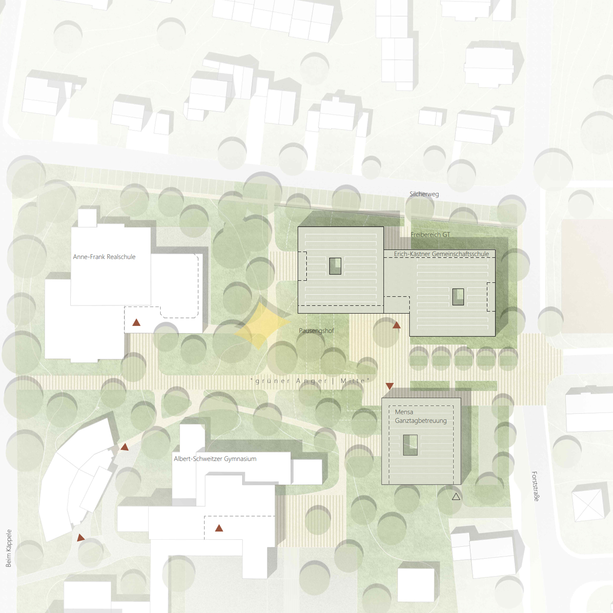 Unser Entwurf für den Neubau der Erich-Kästner-Gemeinschaftsschule in Laichingen setzt den Campusgedanken fort und verbindet zwei dreigeschossige Gebäudemodule über ein zentrales Gelenk mit Treppenhalle. Die klare Struktur sorgt für gute Orientierung, Belichtung und eine angenehme Lernatmosphäre. Die Fassaden bestehen aus sägerauer Weißtanne, die sich harmonisch in die grüne Umgebung einfügt. Die Mensa bietet mit ihren Terrassenflächen funktionale Übergänge zwischen Innen und Außen. Die Lerninsel im Inneren fördert Kommunikation und zeitgemäßen Unterricht durch offene, helle Räume und überdachte Außenbereiche.
